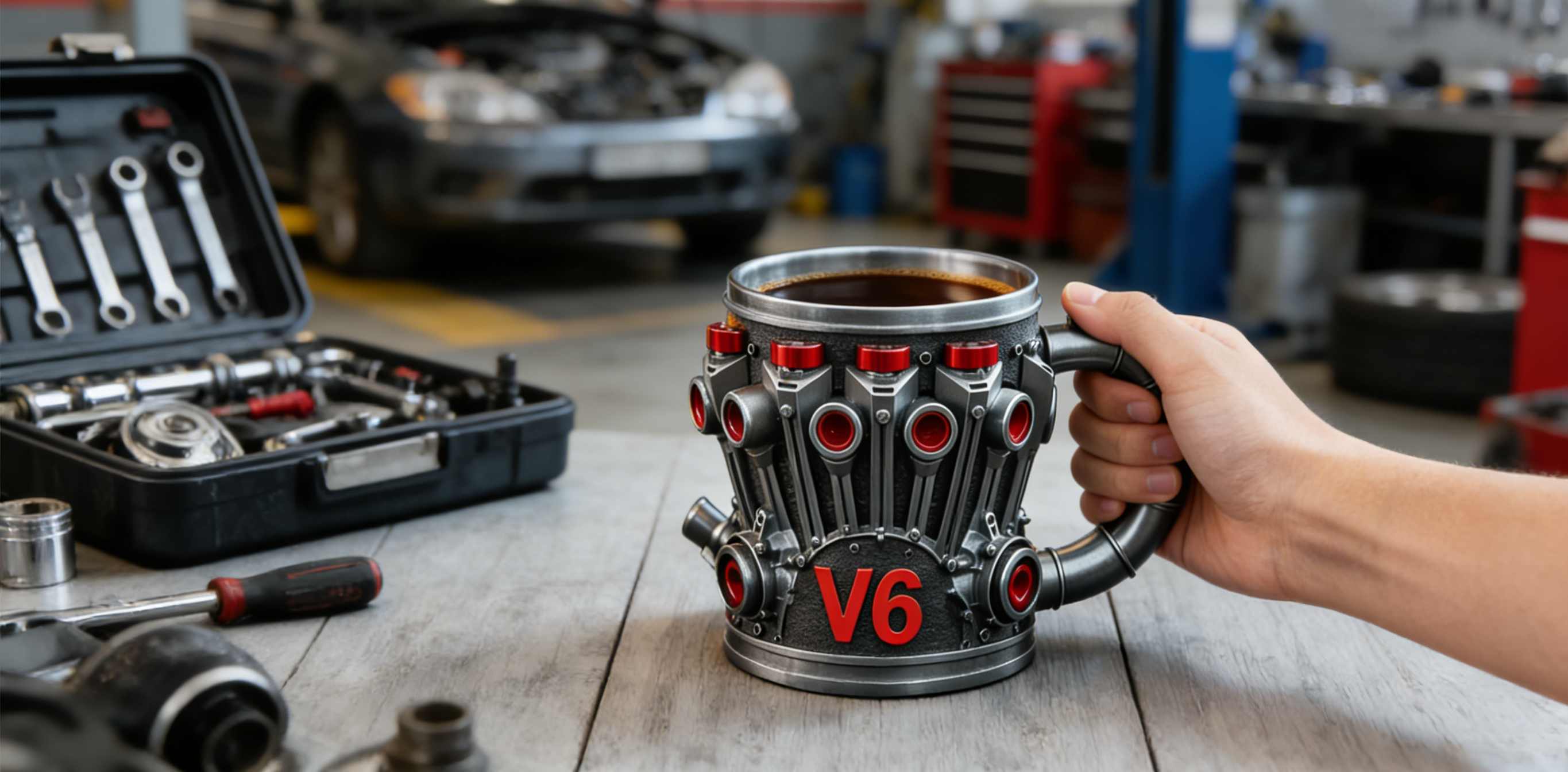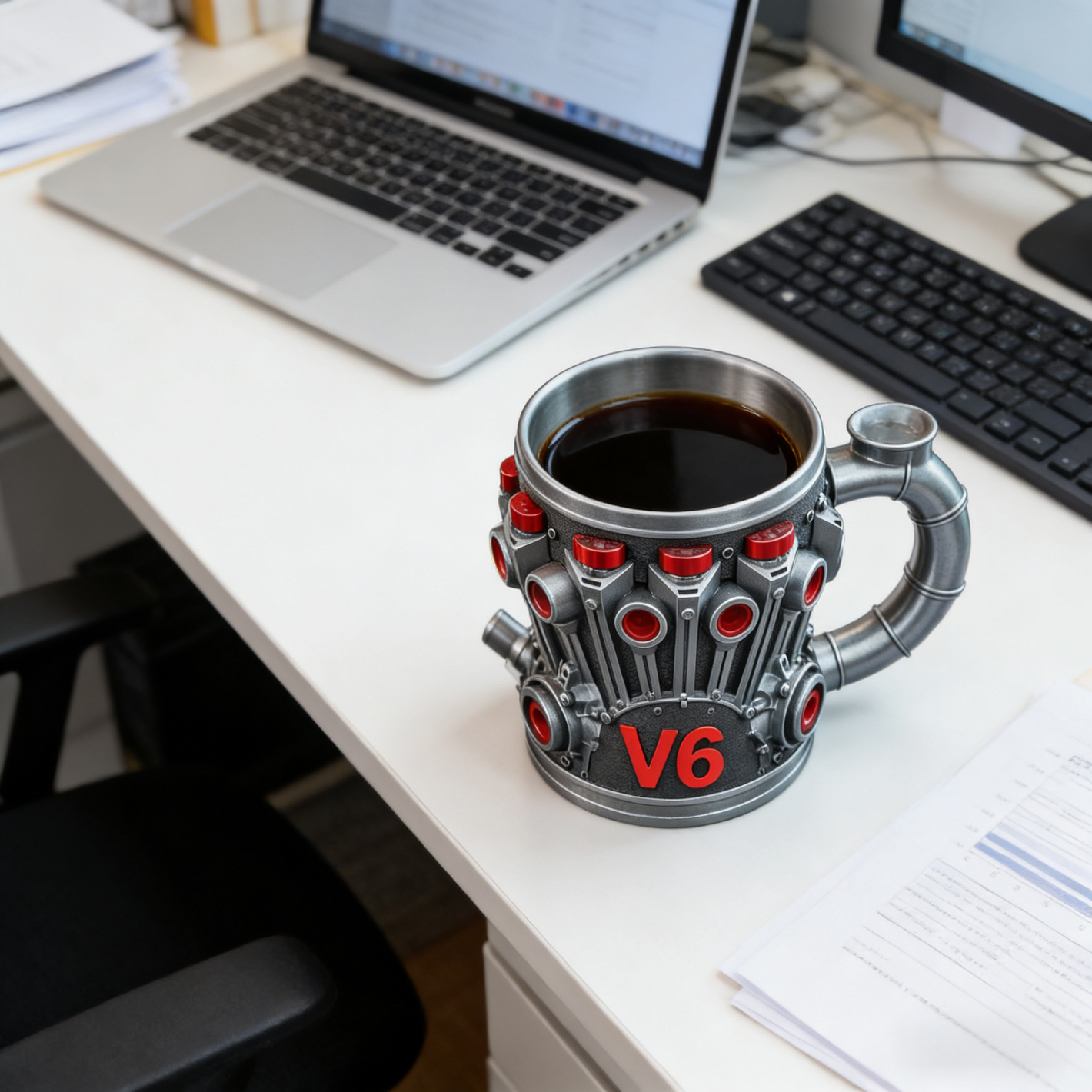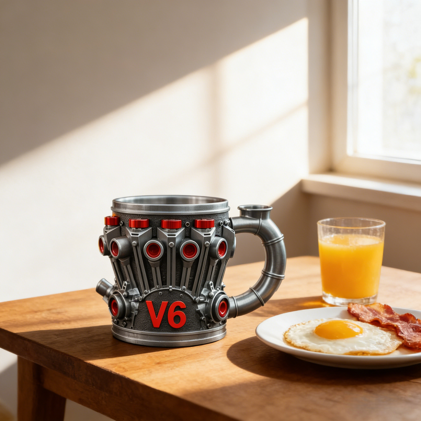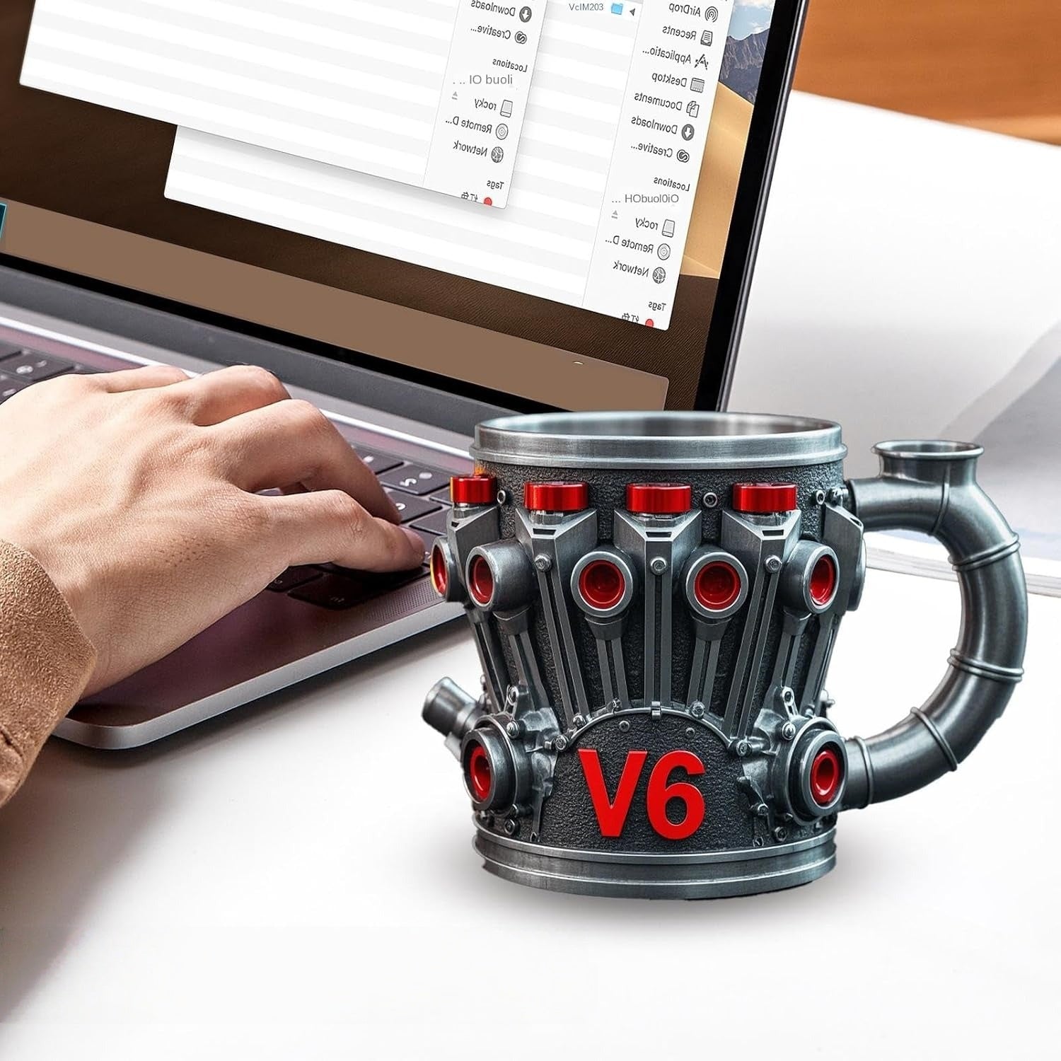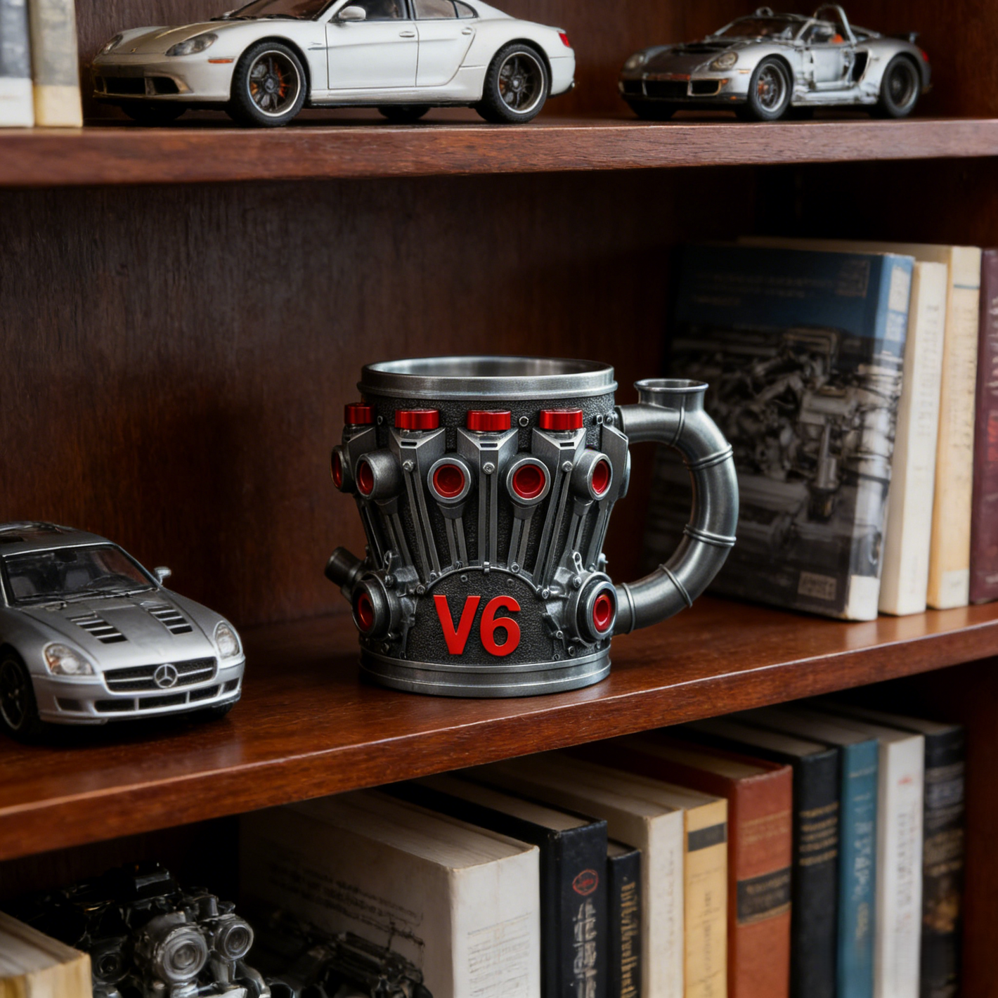 This V6 engine mug is designed to fit your routine, balancing practicality and comfort: