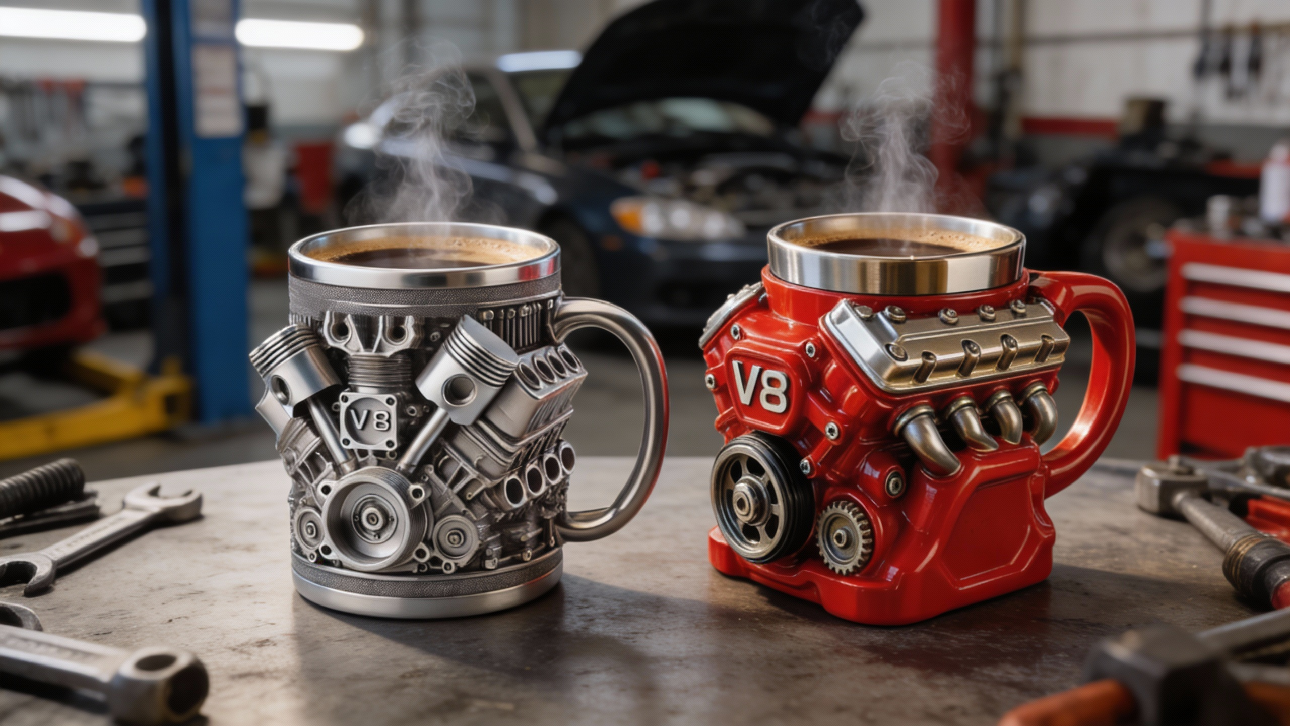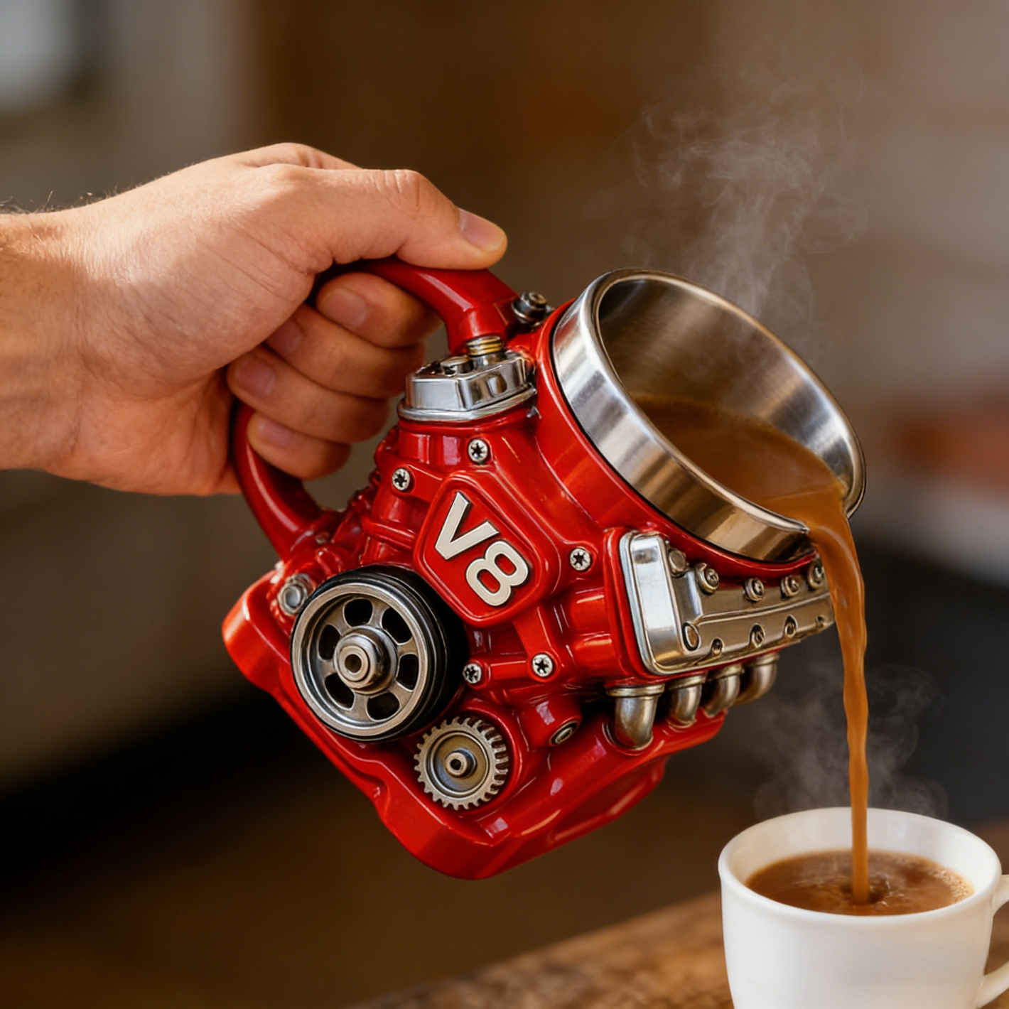 A: It’s made for them! The engine-block-inspired design (matte silver) and racing red finish tie directly to automotive culture. It works as both a functional drinkware piece and garage/desk decor—perfect for birthdays, holidays, or track-day gifts.